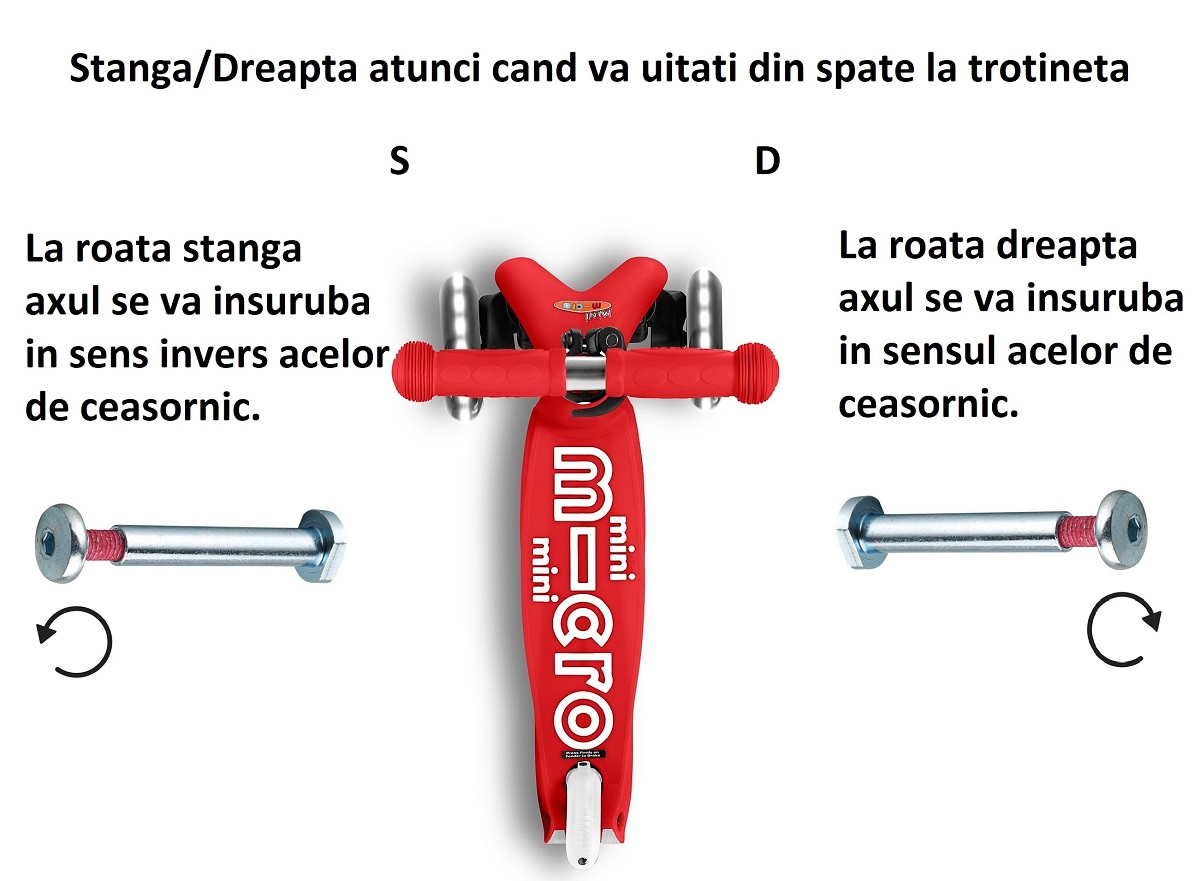 Daca trotineta este mai veche de 2017 va trebui sa pastrati vechiul ax pentru ca acesta este mai scurt. Daca trotineta este mai noua, puteti schimba axurile vechi sau nu. In cazul in care doriti sa le schimbati, va rugam sa aveti in vedere ca la ambele axuri suruburile interioare se insurubeaza in sensul acelor de ceasornic, dar daca le puneti pe de o parte si pe de alta a trotinetei, unul va ramane in sensul acelor de ceasornic si unul invers acelor de ceasornic. Va trebui sa le pozitionati astfel: